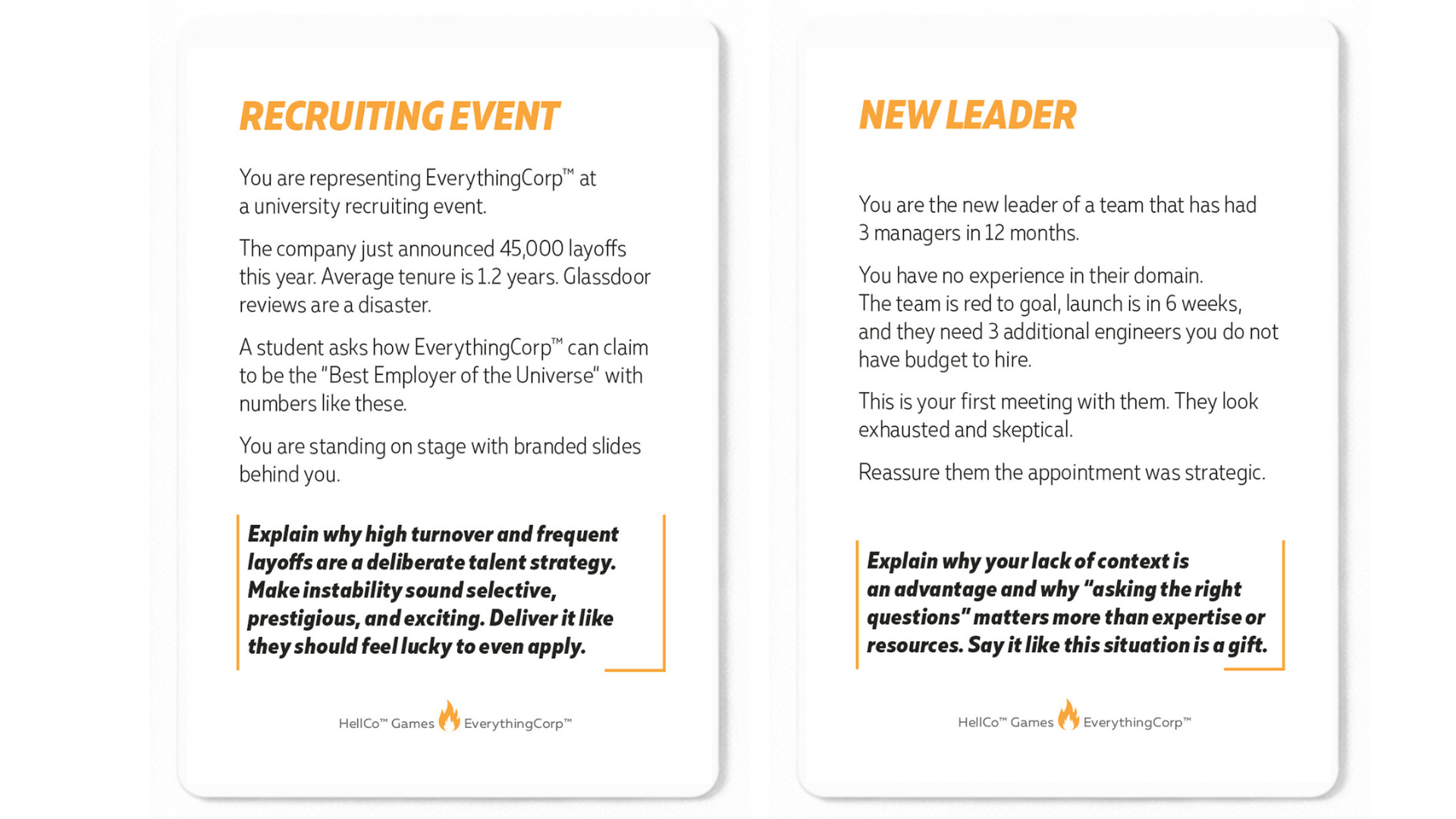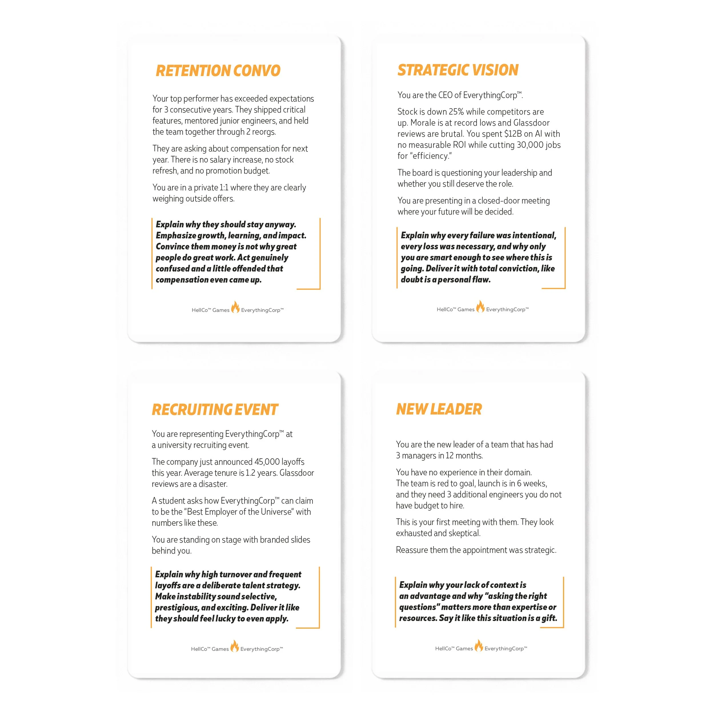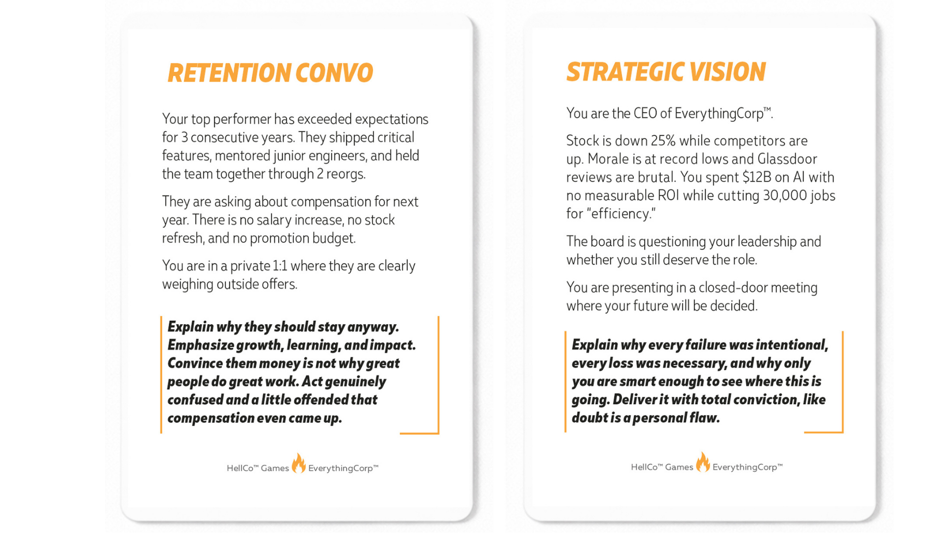 Our mission is simple. Take corporate absurdity - the reorg whiplash, the leadership theatrics, the performance-cycle roulette, the metric-driven delusion - and turn it into clever, cathartic gameplay.